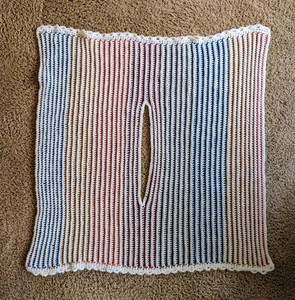 The whole project is just a square with a hole in the middle with a border on two ends. The original concept had some fringe but I opted for a scalloped edge instead. The square was about 30X30 inches. With a stop in the middle at about 15 inches to make the hole and then continue on to the end of the square. You can adjust this size if you want as you go by simply doing 3 or 4 rows in the 30 inch length and laying it across you to be sure it covers where you want it to. Keep in mind the border and scalloped edges will add about 1 inch on each end. In the end, after my adjustments, mine is about 28x28 not including the edging and the hole is in the center at about 14 inches. I typically wear a small or medium size.